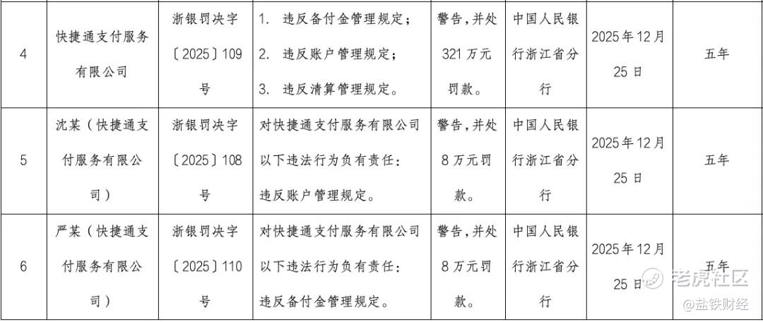 12月31日,央行浙江省分行发布的行政处罚信息显示,快捷通支付服务有限公司(下称“快捷通支付”)因违反备付金管理规定,违反账户管理规定和违反清算管理规定,被警告,并处罚款321万元。处罚公示期5年。