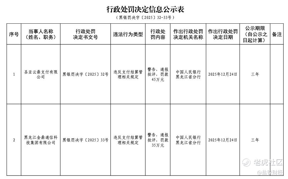 12月31日,中国人民银行黑龙江省公司公布的行政处罚信息显示,圣亚云鼎支付有限公司因违反支付结算管理相关规定被警告,通报批评,罚款45万元。
