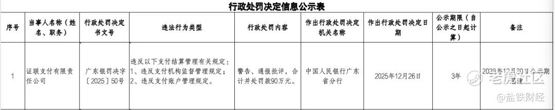 处罚信息显示,证联支付因违反支付机构监督管理规定,违反支付账户管理规定,被警告、通报批评,合计并处罚款90万元,处罚公示期限3年。