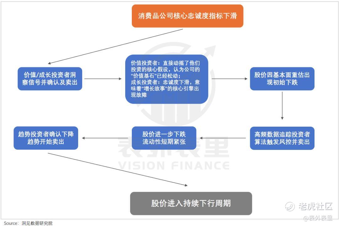 这些指标指向的,是顾客忠诚度的下滑。而在消费品行业,忠诚度是观察消费品公司“护城河”深浅、商业模式壁垒的关键先行指标,一旦不及预期,各类投资者都将出现不同层面的逻辑破坏,进而集体撤退。