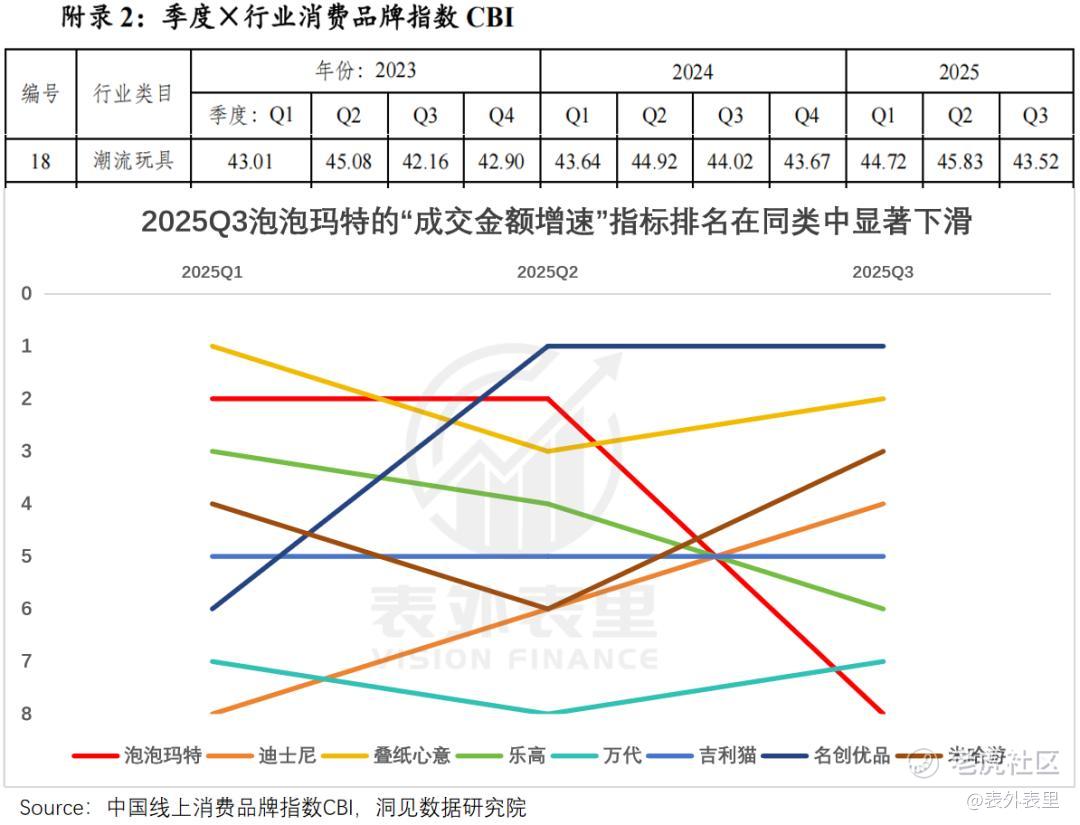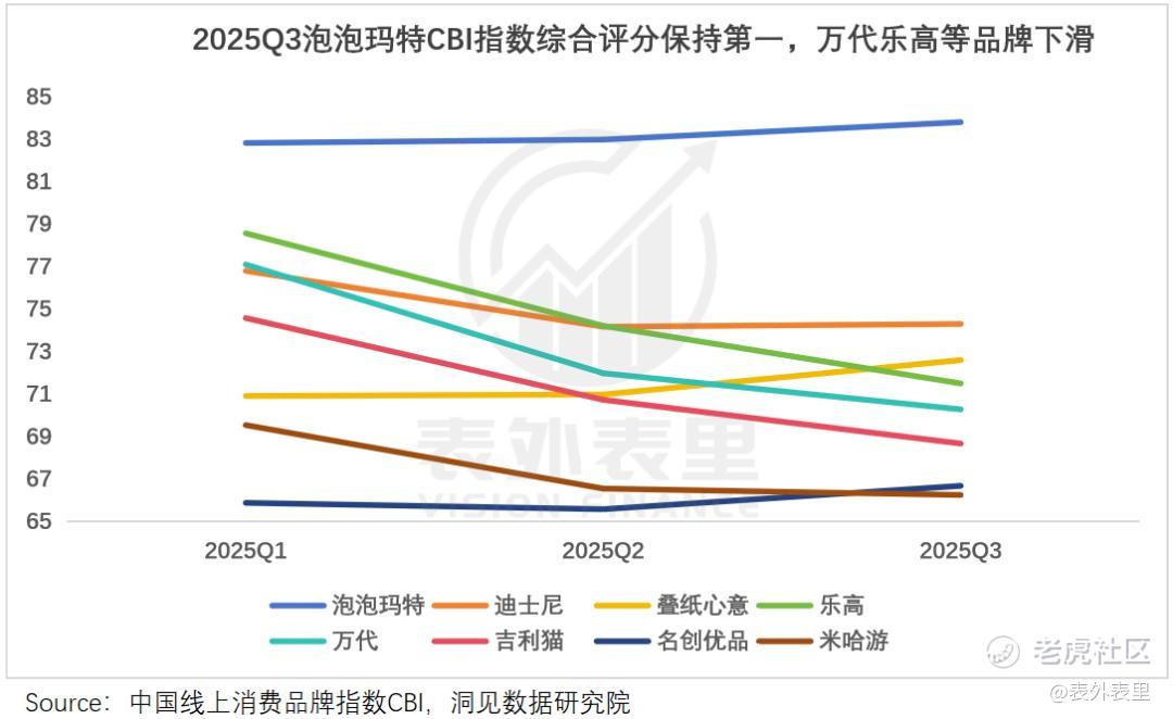 拆解CBI细节指标会发现,泡泡玛特仍稳坐行业“综合评分”第一,反而是乐高、万代等品牌排名下滑,拖着行业景气度下行。这说明,行业格局在进一步分化,利好泡泡玛特等头部品牌。