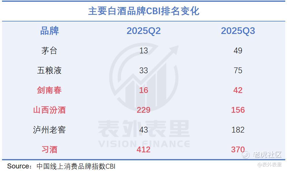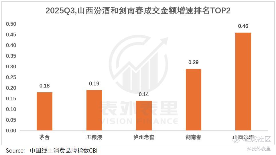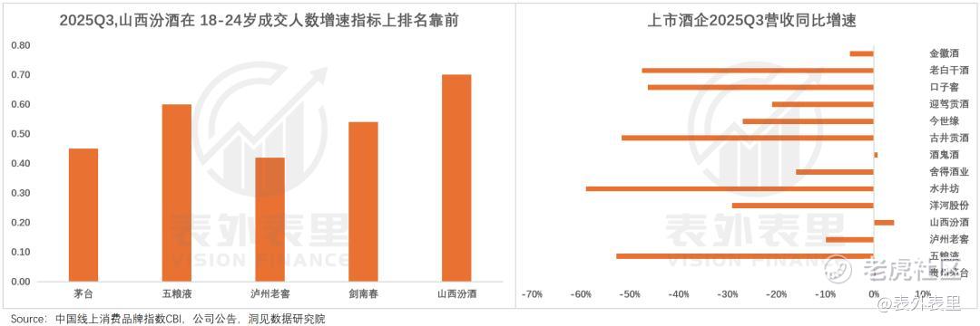 新喝法、新场景、新营销全面推动下,品牌拉进了与年轻群体的距离,汾酒、剑南春三季度的CBI指数中,18-29岁成交金额增速领先。这也直接助推业绩逆势增长,山西汾酒是2025Q3唯三实现营收增长的上市酒企。