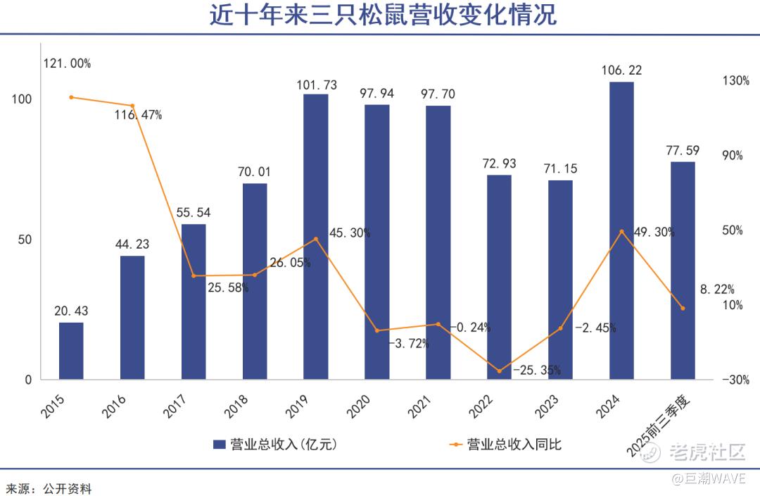 2024年,三只松鼠全年营收106.22亿元,同比增长49.3%,重新回归“百亿营收阵营”并创下历史新高;净利润4.08亿元,同比增长85.51%。其中,抖音渠道贡献了21.9亿元收入,成为公司第一大收入来源,同比涨幅高达81.73%。