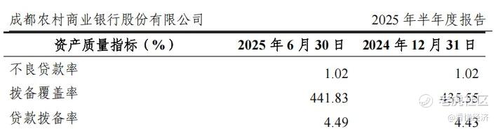截至2025年6月末,成都农商行的核心一级资本充足率为10.87%,一级资本充足率12.56%、资本充足率15.42%;不良贷款率稳定在1.02%,显著低于银行1.52%的平均水平;拨备覆盖率高达441.83%,远超120%的监管红线。