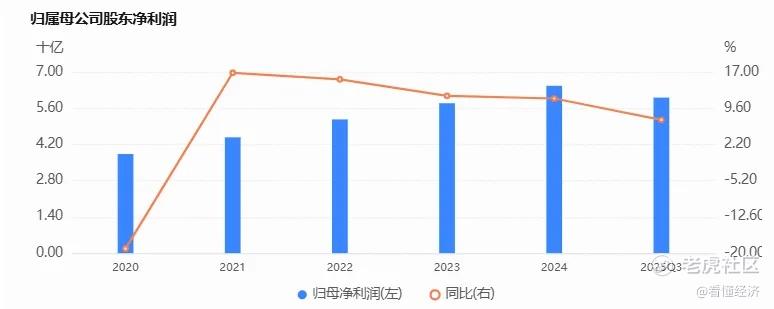 其归母净利润在2020年时为38.29亿元,同比下降19.08%;而后一年,转为正增长,并且在接下来的四年中,均保持双位数增长。