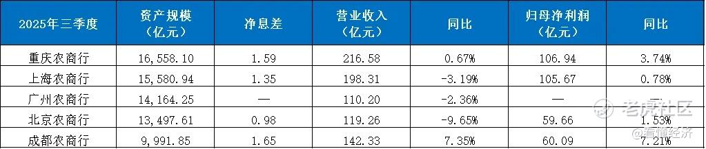 截至2025年三季度,四家农商行——重庆农商行、上海农商行、广州农商行、北京农商行,总资产分别为1.66万亿元、1.56万亿元、1.42万亿元、1.35万亿元。