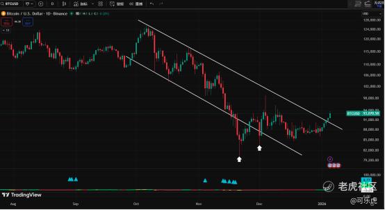 下图这种小碎步走势+布林线收窄,代表BTC正在酝酿一波行情,若近期有2个交易日都站稳9.1万,它会有反弹。