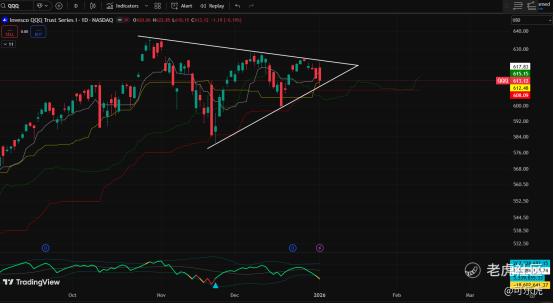 QQQ纳指100,它也能代表大盘走势,因为走势比较经典,今天我们可以解读它:这个严重挤压的形态,说明庄家控盘严重,这几天必须选一个明显的方向了(不是大涨就是大跌,不会继续震荡了)我看多。