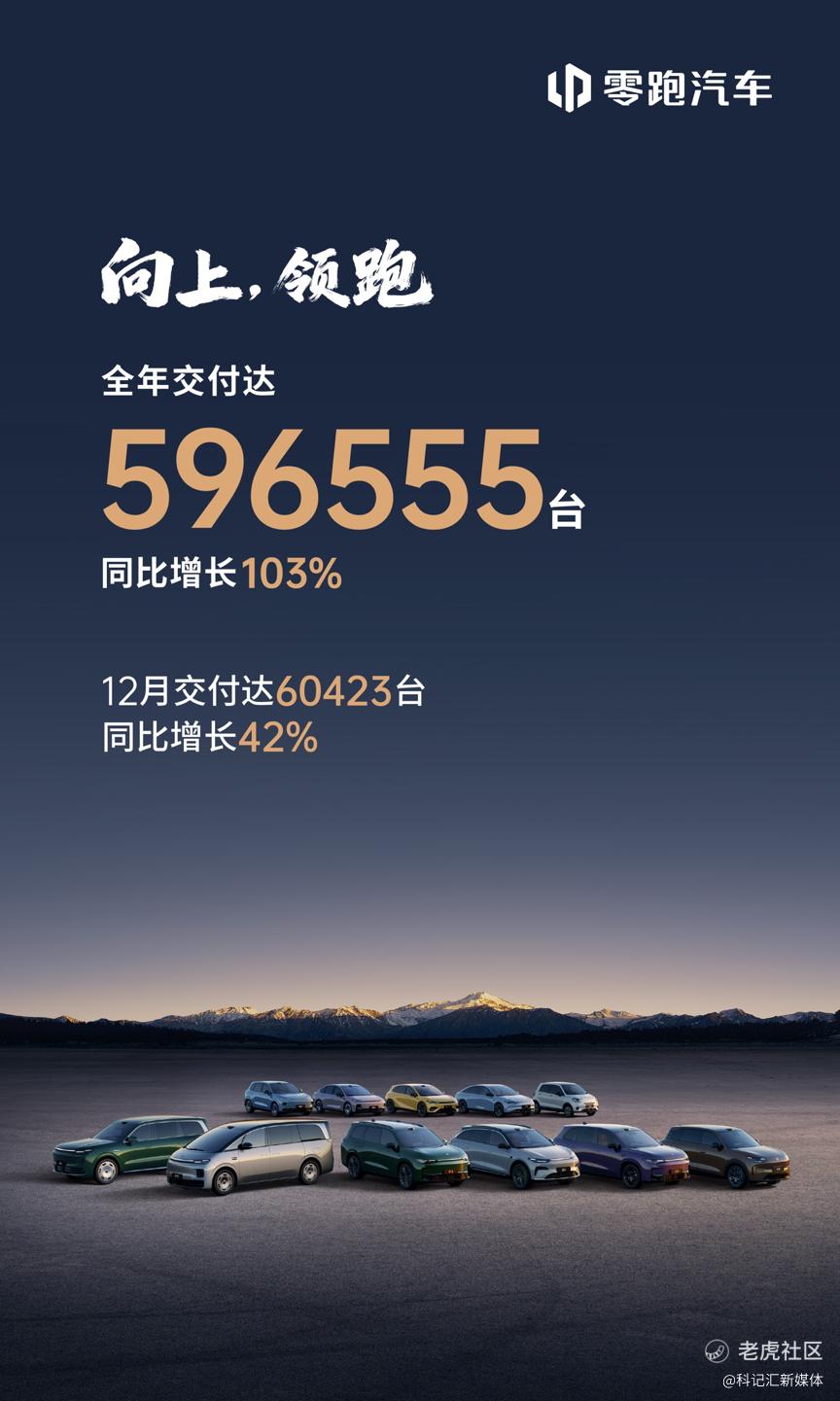 2026年1月1日,零跑汽车公布最新交付数据:2025年12月,零跑全系交付达60423台,同比增长42%;2025年以来,零跑保持强劲增长态势,全年交付达596555台、同比增长103%。
