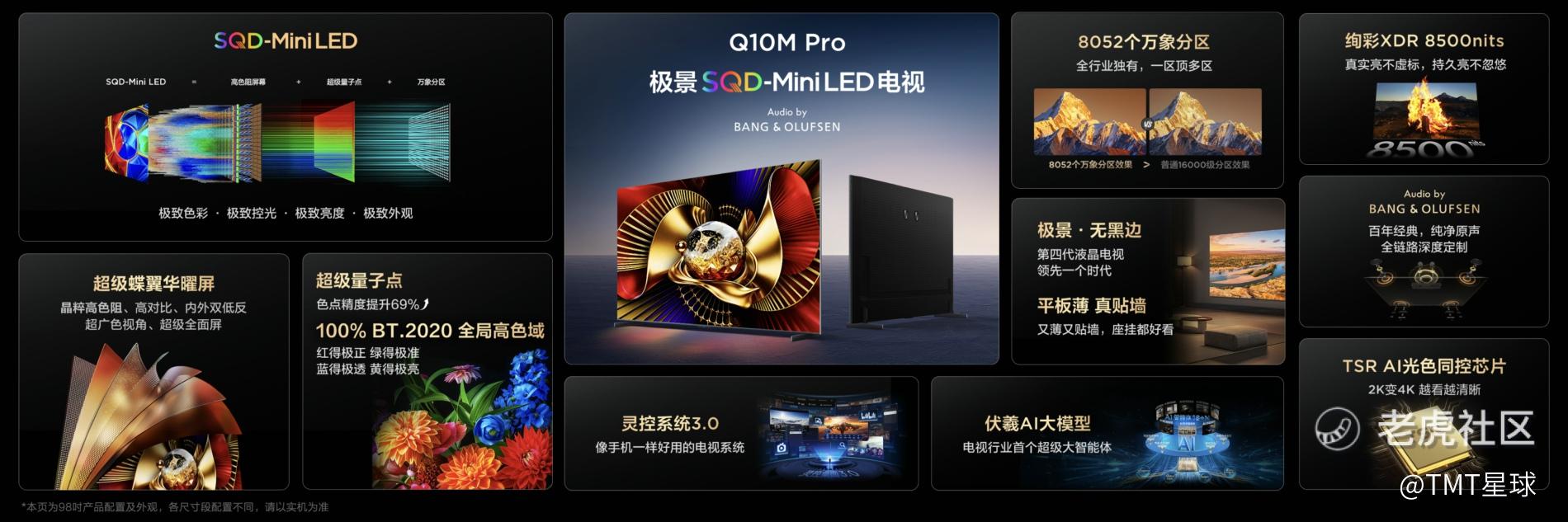 设计上,TCL Q10M Pro采用行业领先、有口皆碑的“极景·无黑边”外观,以近100%屏占比与平板薄机身重塑美学标杆。体验层面,其搭载与Bang & Olufsen深度定制的专业音响系统、像手机一样好用的灵控系统3.0、集成国内主流AI能力的伏羲大模型,以及满血HDMI 2.1接口等顶级配置,提供全方位巅峰体验。
