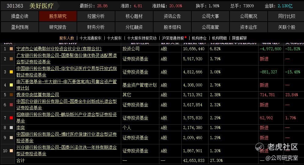 美好医疗(301363.SZ),重仓机构:国泰聚合价值优势、华宝中证医疗;