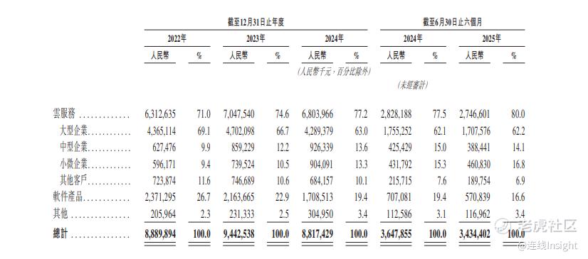 时至今日,用友的各类客户数量仍在增加。截至2025年9月30日止的九个月,采用用友云服务的大型企业、中型企业及小微企业客户数量分别为6065家、13837家及491043家,而2024年同期,上述数据分别为5650家、11540家及463757家。