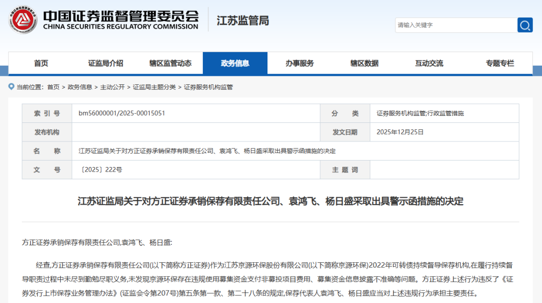 方正证券:因京源环保督导业务未勤勉尽职,被江苏证监局出具警示函