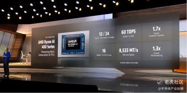 今日,苏姿丰宣布推出全新的Ryzen AI 400系列,业界最广泛、最先进的AIPC处理器系列。采用12 个 Zen 5 架构 CPU 核心和 24 个线程、16 个 RDNA 3.5 架构 GPU 核心、一个 60 TOPS 的 XDNA 2 NPU,以及 8,533 MT/s 的内存速度。AMD 表示,与 Intel Core Ultra 9 288V 相比,Ryzen AI 400 系列在内容创作方面速度提升 1.7 倍,在多任务处理方面速度提升 1.3 倍。