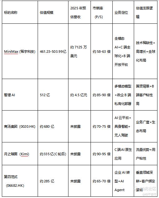 横向对比来看,MiniMax的市销率(58-63倍)低于智谱AI(85-90倍)、月之暗面(90-95倍),略低于商汤集团(70-75倍),高于第四范式(65-70倍),处于合理估值区间。考虑到MiniMax的全模态技术稀缺性、70%+的海外收入占比以及174.7%的营收增速,当前估值不仅没有泡沫,反而具备一定的安全边际。