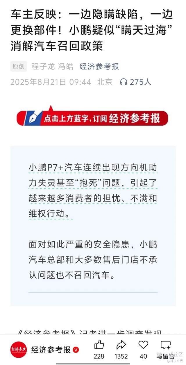 在更早的P7+车型转向机安全隐患事件中,小鹏的处理方式已经暴露了一些问题所在。巧合的是,该事件同样在去年8月被《经济参考报》曝光。