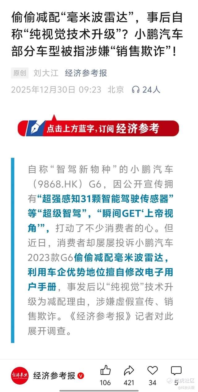 该调查直指小鹏汽车2023款G6车型被消费者投诉存在“偷偷减配毫米波雷达,事后以‘纯视觉技术升级’搪塞”的问题。