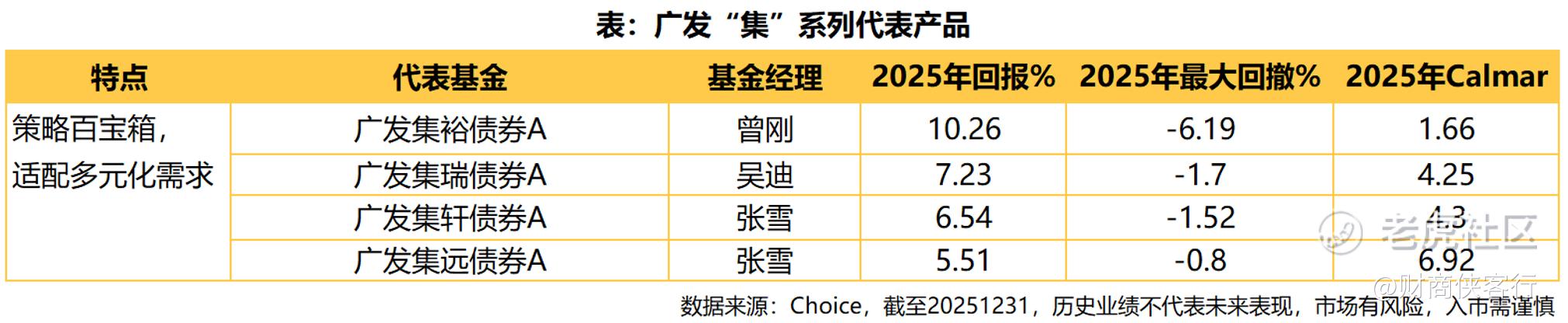 广发聚泰(A类:001355)则是“聚”系列的低波稳定派,由债券投资部总经理宋倩倩管理,自其2021年9月管理以来该基金不投股票,收益增厚全靠少量转债。数据显示,自2015年6月成立以来,广发聚泰历史上10个完整年度均实现正收益,成立以来年化回报达到5.56%。(数据来源:Choice,截至20251231)