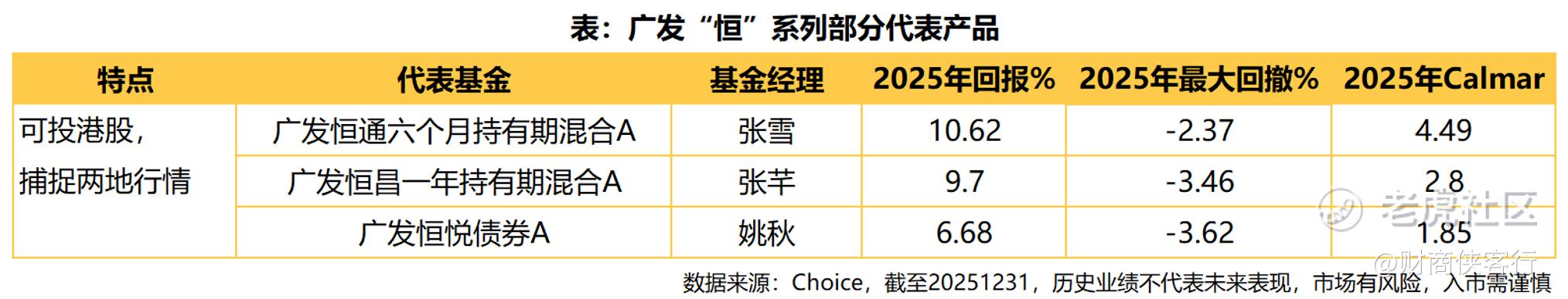 例如张雪管理的广发恒通六个月持有期(A类:010036),2025年度基金净值回报为10.62%,根据银河证券基金评价中心,在同类的普通偏债型基金(股票上限不高于30%)(A类)中排名前1/8(39/313),且将最大回撤控制在2.5%以内。张雪是一位具备宏观视野的基金经理,她的策略是通过大类资产配置追求稳定上涨的业绩曲线,2025年主要抓住了港股、创新药、黄金、互联网等细分资产机会。