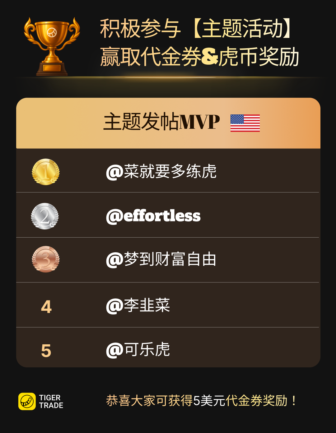 恭喜以下5位小虎,成为近期主题发帖积极&精彩用户,可获5美元代金券奖励