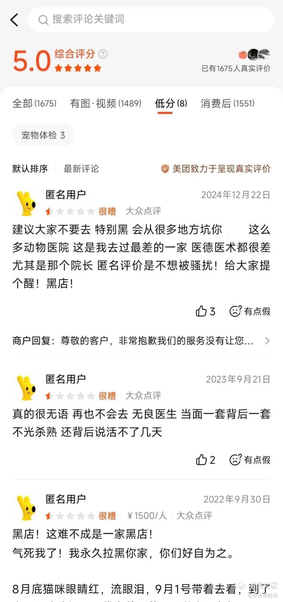 「创业最前线」在美团App上搜索瑞派宠物医院的评价呈现出两极情况,有人打五星,说兽医妙手回春,有人打一星,说医生没有医德只想赚钱。