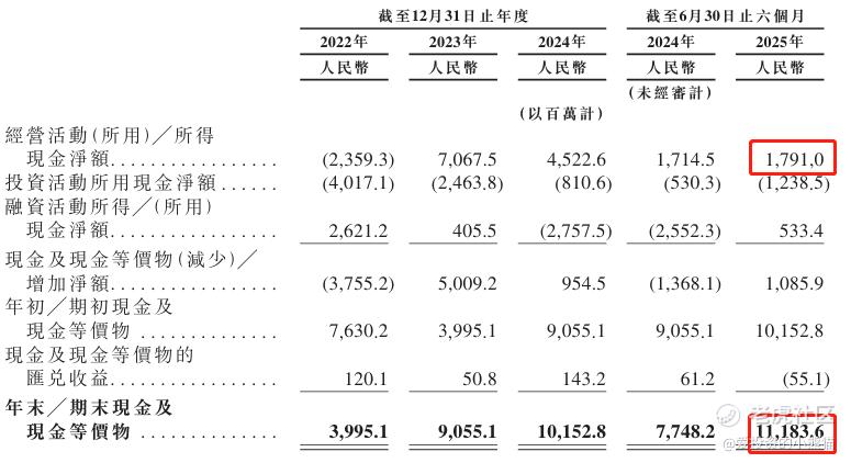截至2025年6月30日,公司经营活动现金流为人民币17.91亿元,期末现金约为118.84亿元。