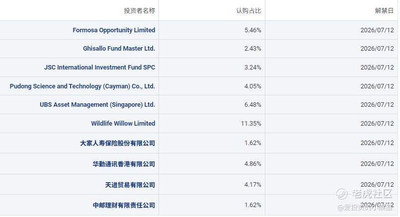 豪威集团在IPO前引入了10家多元背景的基石投资者,涵盖国际资管机构、产业资本、保险及理财机构、跨境投资基金等类型,认购总占比45.28%,所有基石投资者的股份解禁日均为2026年7月12日,各投资方认购占比及背景特点如下: