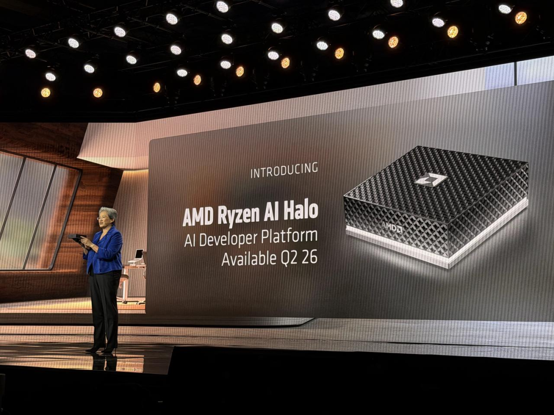 终端与边缘侧:发布了全新的Ryzen AI平台,覆盖AI PC与嵌入式应用场景,并正式推出Ryzen AI Halo开发者平台。AMD称其为世界上最小的AI开发系统,配备128GB高速统一内存,支持在本地运行2000亿参数规模的大模型,预计2026年第二季度推出。
