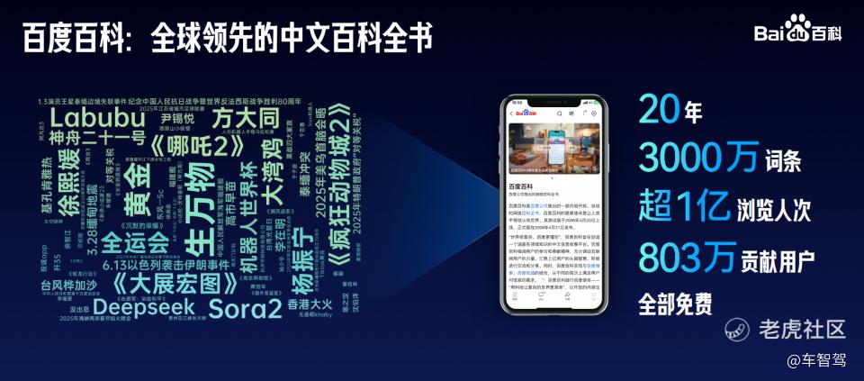 截至目前,百度百科词条总量已突破3000万,累计贡献用户数超803万;此外,百度百科“繁星计划”已联合国科大、中科院、北京大学等头部机构的超10万专家和专业创作者,共建超100万条专业知识。