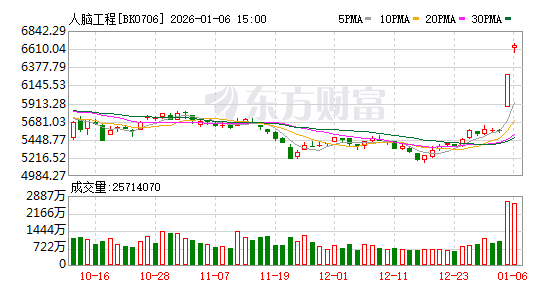 对应到A股,这一技术相关公司主要集中在人脑工程板块。开年第一个交易日,这一板块暴涨13.24%,成交500.40亿元,主力净流入61.2亿。