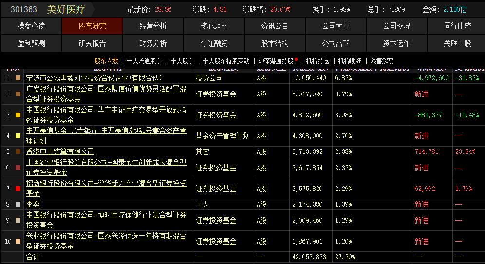 美好医疗(301363.SZ),重仓机构:国泰聚合价值优势、华宝中证医疗;