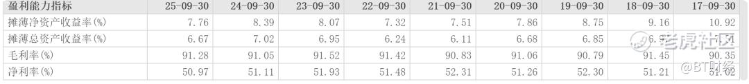 2024年茅台毛利率和净利率为91.93%和52.27%,2025年前三季度毛利率为91.29%,净利率为52.08%,整体上看下降不少,同比2024年前三季度91.53%毛利率和52.19%的净利率也有一定下滑。