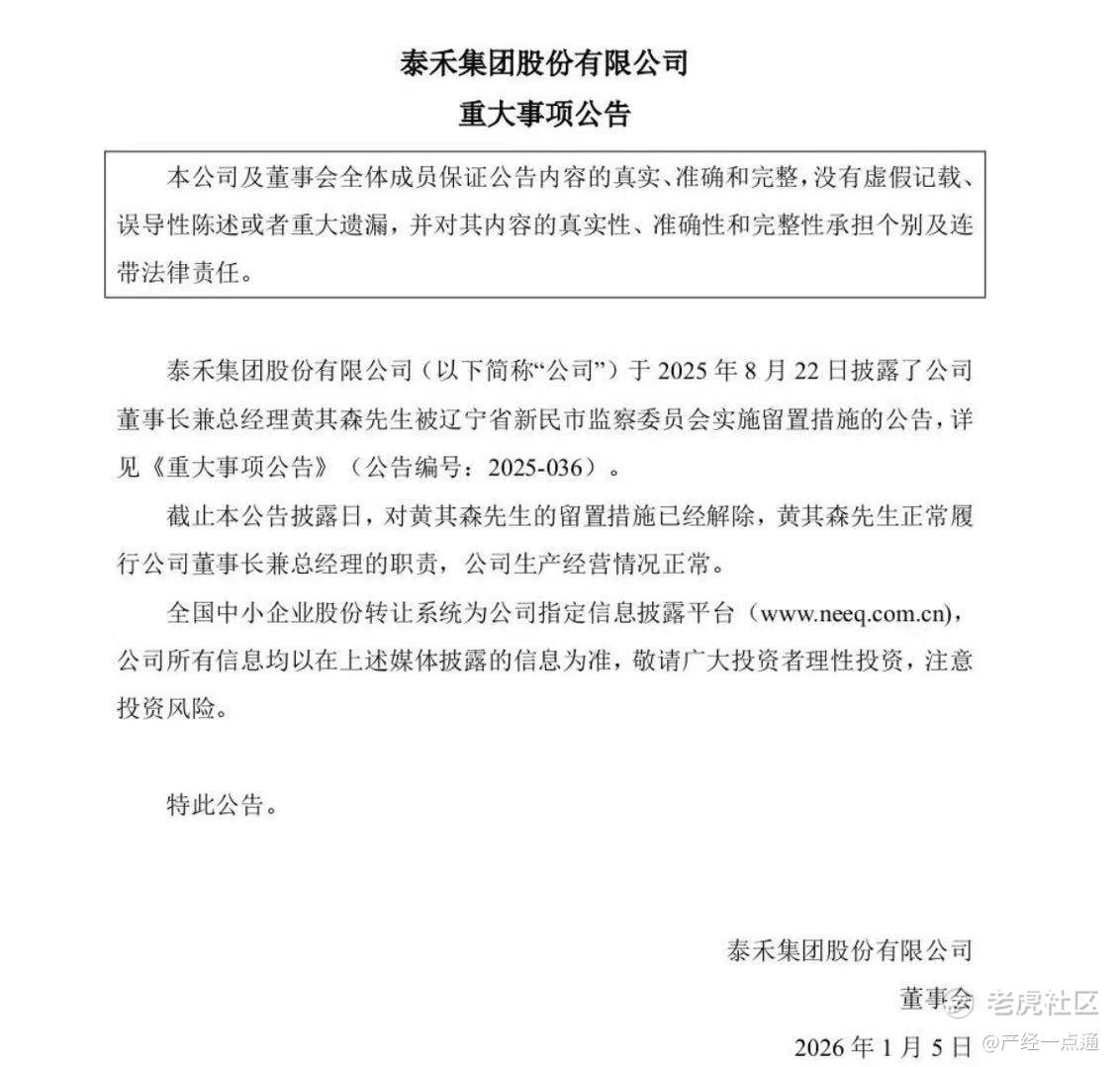 1月5日晚,泰禾集团股份有限公司发布《重大事项公告》称,截止本公告披露日,针对公司董事长兼总经理黄其森的留置措施已解除,黄其森正常履行公司董事长兼总经理的职责,公司生产经营情况正常。