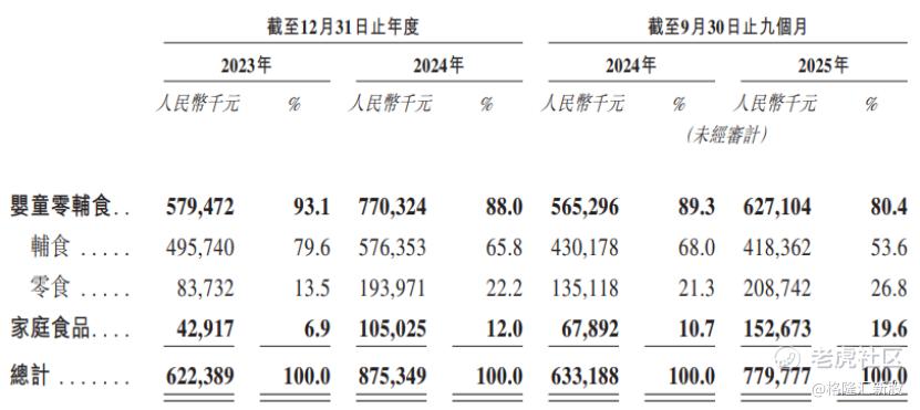 具体来看,2023年、2024年和2025年1-9月(简称“报告期”),爷爷的农场来自婴童零辅食的收入占比有所下降,但仍在80%以上;家庭食品的收入占比从6.9%提升至19.6%。