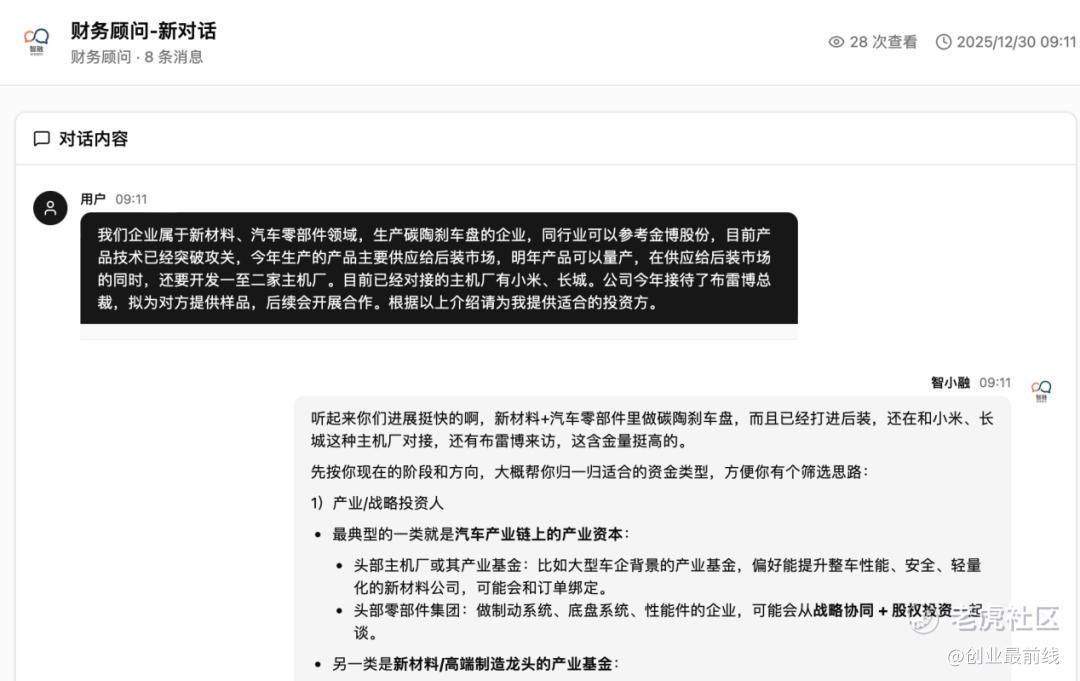 “在朋友介绍下,我注册登录了创小融,从10:57聊到11:10仅用13分钟,就完成了项目核心信息的梳理,随后平台就开始精准匹配投资人。”项目创始人的表述,凸显了智能服务的高效优势。