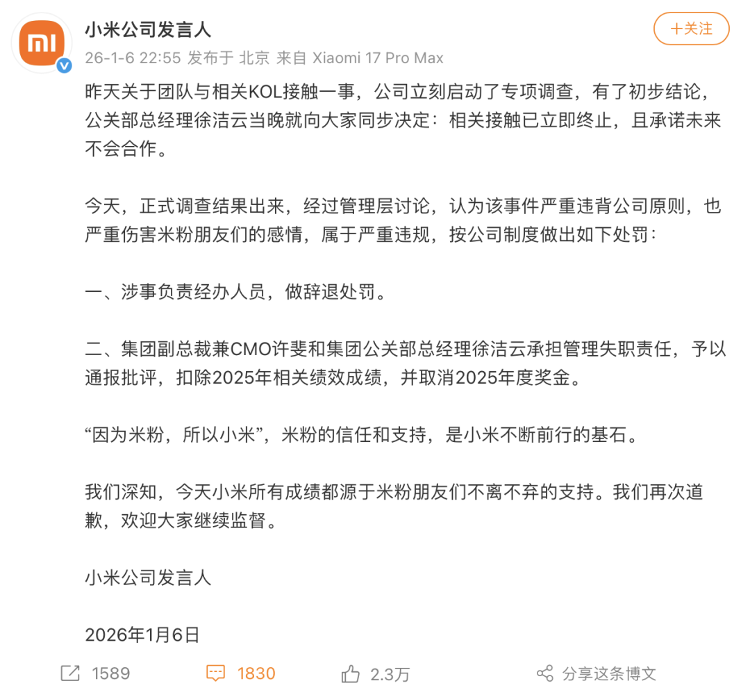 先来简单回顾一下这个事情,昨日,小米计划与一向“黑小米”的某自媒体KOL开展商业合作,消息一出便引起部分米粉的不满情绪,引发网友热议。而在雷军和小米公关部总经理徐洁云的微博评论区,也有不少网友留言抵制相关合作。于是呢,小米火速做出反应,先是徐洁云出来道歉,昨日深夜,小米又发文,开除涉事员工,并对两位高层进行惩罚。