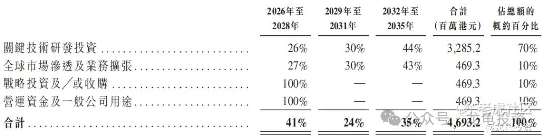全球募集资金净额46.93亿港元,约70%用于关键技术研发投资;约10%用于全球市场渗透及业务扩张;约10%用于战略投资或收购;约10%营运资金及一般公司用途。详情见表: