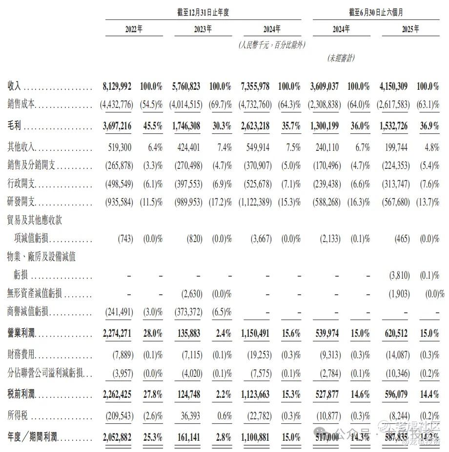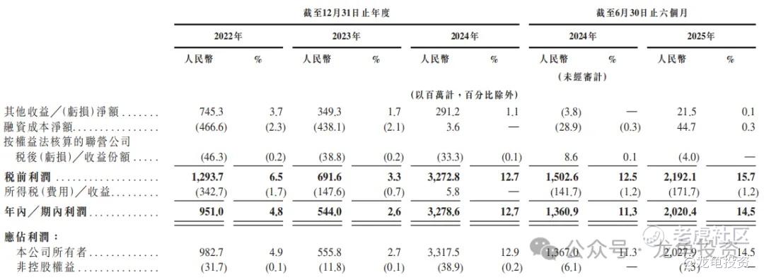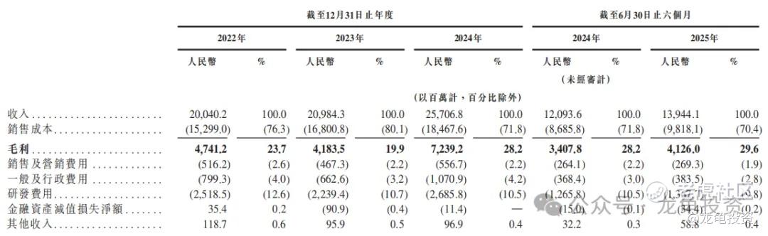 公司22-24年营收分别为200.4亿人民币、209.84亿人民币和257.06亿人民币;25年H1营收139.44亿人民币,较上一年同时期120.93亿人民币,增长15.30%;22-24年毛利分别为:47.41亿人民币、41.83亿人民币和72.39亿人民币,25年H1毛利41.26亿人民币,较上一年同期34.07亿人民币,增长21.1%;22-24年期内利润分别为:9.51亿人民币、5.44亿人民币和32.78亿人民币;25年H1净利20.20亿人民币,较上一年同期13.61亿人民币。