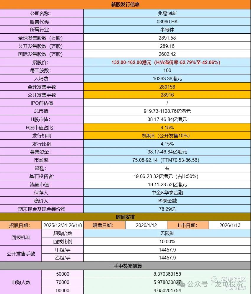 兆易创新全球发售股数2891.58万股,每手100股,招股价132-162港元,入场费16363.38港元,采用机制B发行,公开发售28916手,孖展倍数14.41倍,预计5-9万人参与,一手中签率5%,申购100手稳一手。
