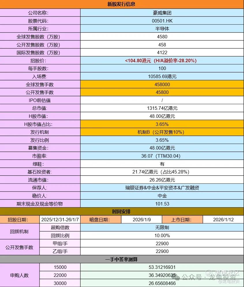 豪威集团全球发售股数4580万股,每手100股,招股价不高于104.8港元,入场费10585.69港元,采用机制B发行,孖展倍数2.86倍,预计1.5-3万人参与,一手中签率50%,申购4手稳一手。