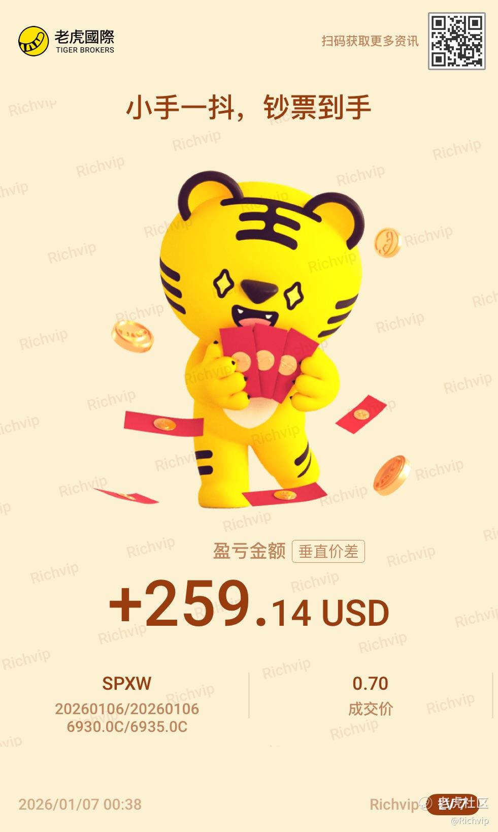 $标普500 垂直价差 260106 CALL 6930.0/CALL 6935.0$ 从2025年12月25日开始做spx的末日期权操作,今天是连续第七天获胜;到目前胜率100%。每天花1000~2000刀保证金,每晚收租金200刀左右。感觉挺爽,还可以早早睡觉!😴