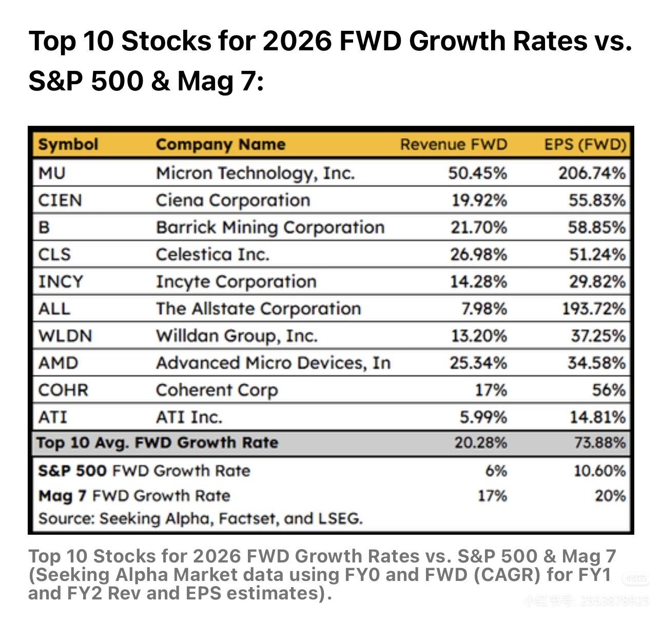 昨天Seeking Alpha发布了最新2026 Top 10,预测的是盈利增速将超过大盘,甚至Mag 7的一揽子股票。美光,给出的前瞻EPS为206.7%,看起来很夸张,基本上就是分析师一致预期当前盈利是处在周期低点的。[丢脸]