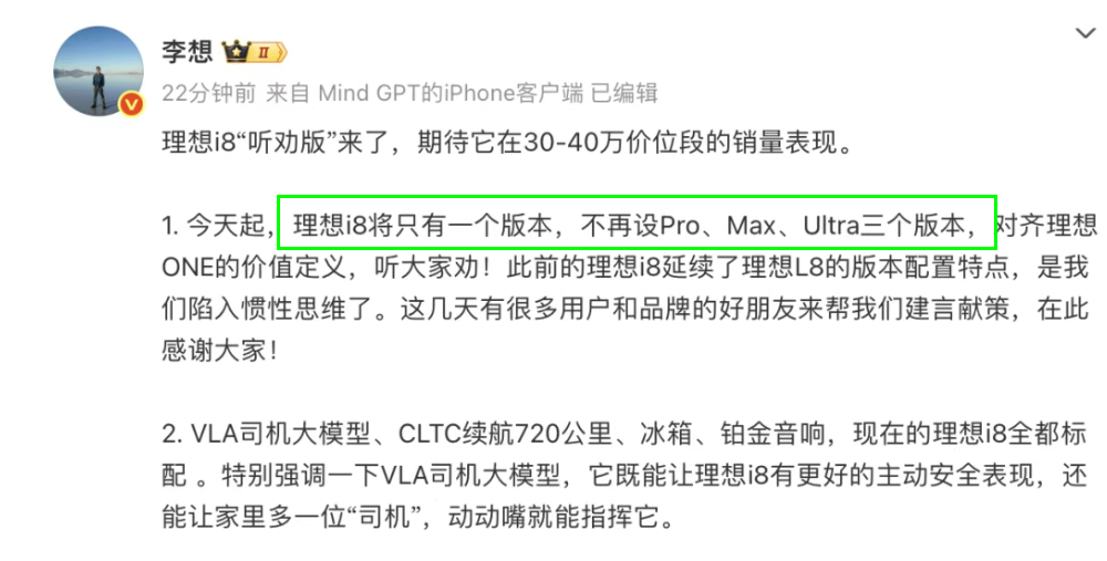最终,那个本应是走量担当的入门版 Pro,几乎无人问津。理想把中间的 Max 版变成了唯一的“顶配版”,直接砍掉了另外两个版本。