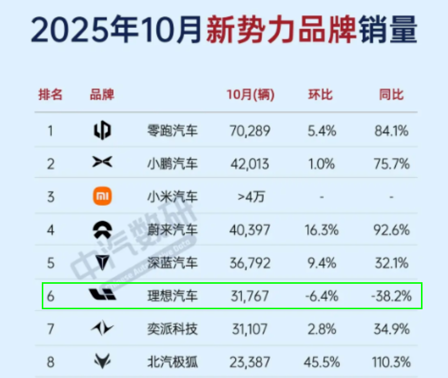 甚至今年10月,理想在国内新势力中的交付量为3.18万辆,同比下滑38.2%,在排行榜中跌至行业第六位,首次被挤出了前五。