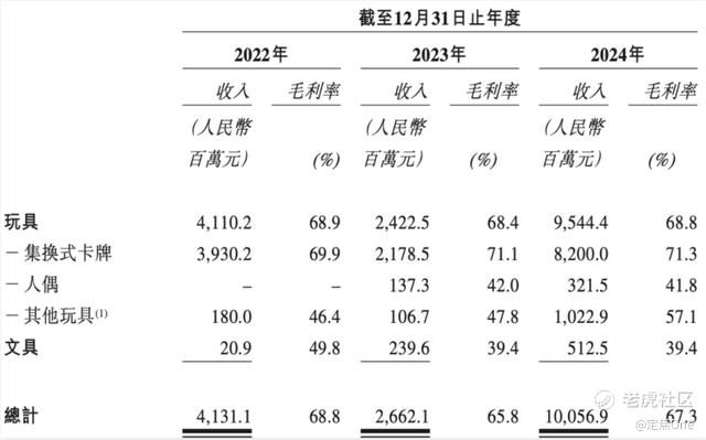 据此前卡游招股书,2022年-2024年,其营收分别为41亿、26亿、100亿。2024年同比营收涨幅近300%。拉长时间维度看,2019年其营收不到10亿元,五年内即突破百亿规模,吸金能力堪称强悍。