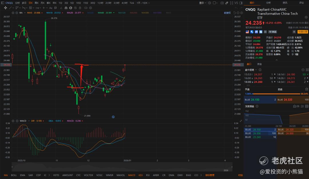 对于投资者而言,把握CNQQ的投资机会需要结合产品特性与市场节奏制定策略。短期来看,可依托事件驱动捕捉脉冲机会:降息周期下外资更倾向配置成长型资产,中概科技是核心标的,而CNQQ的MACD指标已形成金叉,短期技术面回暖,可等待价格回调至23.8-24.0美元区间时小仓位建仓,利用美股全时段交易优势,快速响应政策发布、中概股财报等利好消息。中期则适合采用定投策略,鉴于中国硬科技赛道受“十五五”规划重点扶持,且美元走弱、人民币吸引力提升的汇率红利有望延续,周定投的方式能有效平滑次新ETF的价格波动。