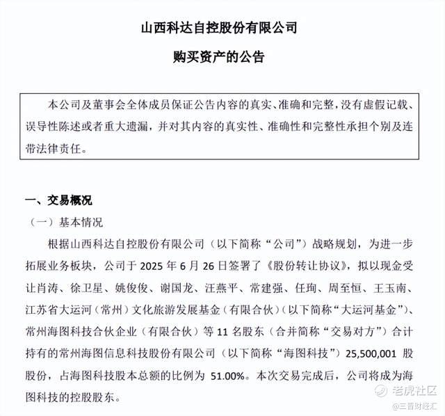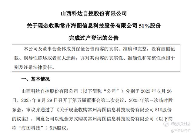 2025年12月31日,山西北交所第一股科达自控(920932.BJ)发布公告,宣布其对常州海图信息科技股份有限公司(以下简称“海图科技”)51%股权收购已完成过户登记。