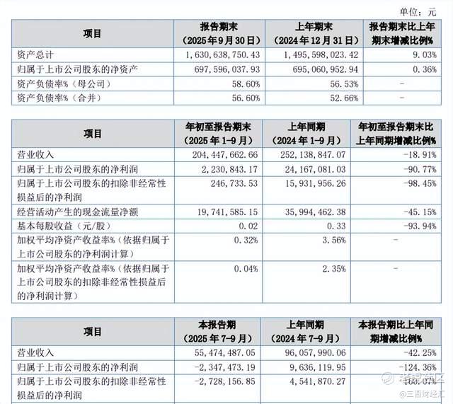 2025年科达自控业绩压力进一步凸显。前三季度实现营收2.04亿元,同比下降18.91%;归母净利润223.08万元,同比下降90.77%。单季度更是由盈转亏,实现归母净利润-234.75万元。