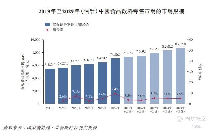 中国零食饮料零食市场:食品饮料作为满足大众休闲享受与日常营养需求的重要品类,是中国消费市场的关键组成部分,在中国经济扩张、城镇化推进及居民可支配收入提升的推动下,中国已成为全球最大的食品饮料市场,且因产品的日常必需属性,未来市场将维持平稳增长;而在衔接消费者与厂商中发挥重要作用的中国食品饮料零售行业,近年也实现稳定增长,市场规模从2019年的5.5万亿元增至2024年的7.1万亿元,复合年增长率5.2%,预计2029年将达约8.7万亿元,2024-2029年复合年增长率为4.3%。