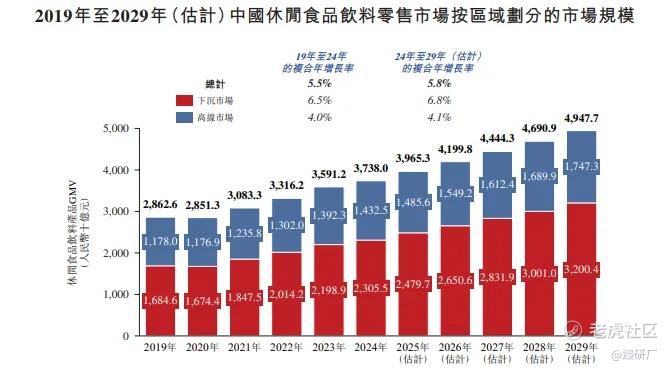中国休闲零食饮料零食市场:近年来,在食品消费水平提升、消费场景多样化兴起及消费偏好转变的驱动下,中国休闲食品饮料零售行业实现稳定增长。2019年至2024年间,中国休闲食品饮料零售行业的市场规模从人民币2.9万亿元增长至人民币3.7万亿元,复合年增长率为5.5%。展望未来,预期中国休闲食品饮料零售行业将持续扩张,2029年市场规模预计将达到人民币4.9万亿元,2024年至2029年的复合年增长率为5.8%。